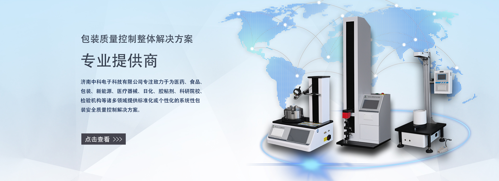 濟南中科電子科技有限公司是一家集包裝及膜材檢測儀器的研發(fā)、制造、銷售和服務(wù)為一體的專業(yè)科技公司。專注致力于為食品、醫(yī)藥、包裝、新能源、醫(yī)療器械、石化、日化、膠粘劑、科研院校、檢驗機構(gòu)等諸多領(lǐng)域提供標準化或個性化的系統(tǒng)性包裝及膜材質(zhì)量控制解決方案。